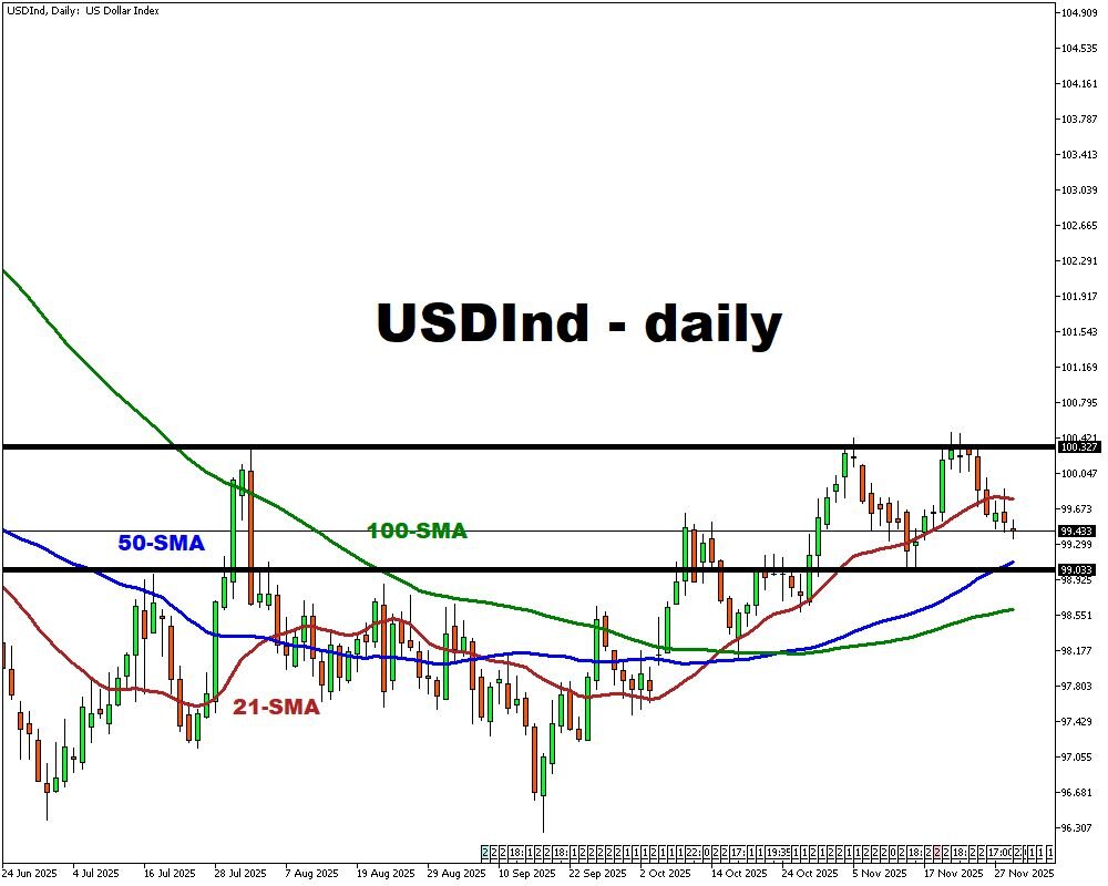 For USDInd, the U.S. PCE reading will help clarify how consumers and prices are progressing, a key consideration for how broad dollar sentiment forms. Also note, with liquidity thinning into December and global activity indicators sending mixed signals, many retail traders may notice sharper intraday reactions around major data releases.